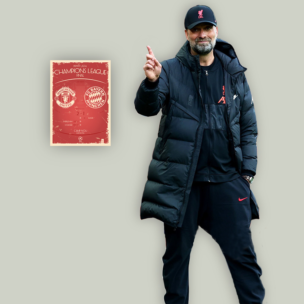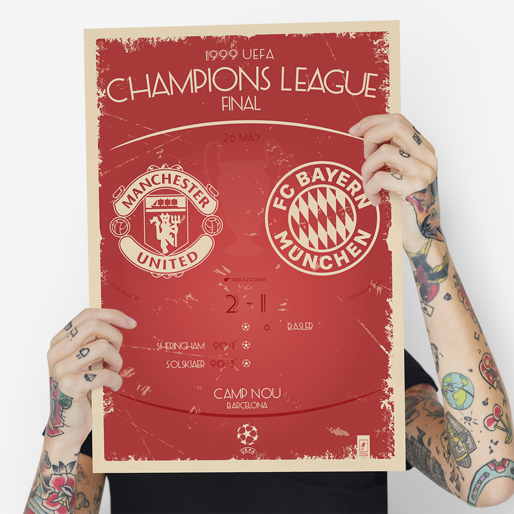 Пам’ятний постер із результатами матчу фіналу Ліги Чемпіонів 1999 року в Барселоні між Манчестер Юнайтед та Баварією.